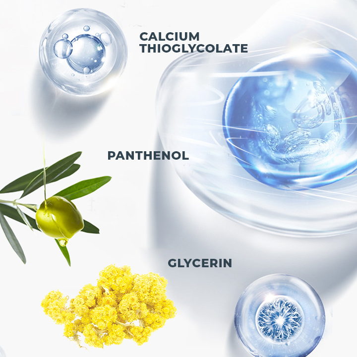• Core ingredients: Calcium thioglycolate, Panthenol, Glycerin, Stearyl alcohol, Niacinamide, Italian helichrysum, Bisabolol, Yeast extract, Saffron extract